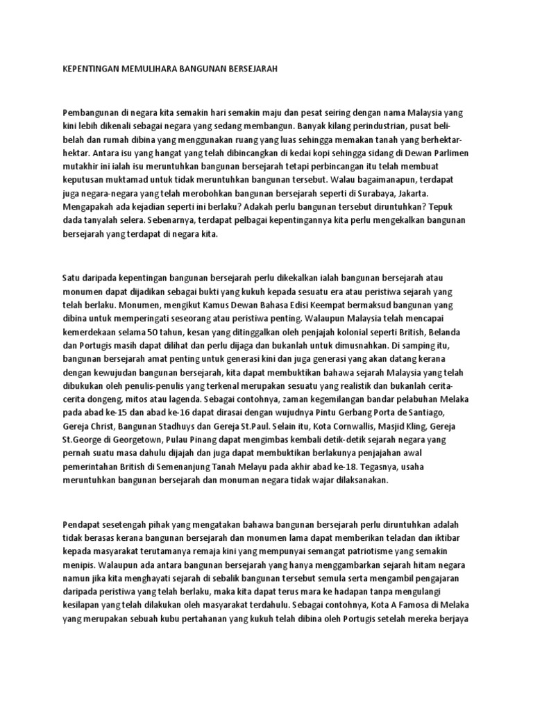 Anda boleh menggunakan contoh karangan di bawah sebagai panduan untuk membantu dalam. Kepentingan Fungsi Bangunan Bersejarah Malaysia dan Keadaan Pada Masa Kini. Mempunyai daya tarikan tersendiri.